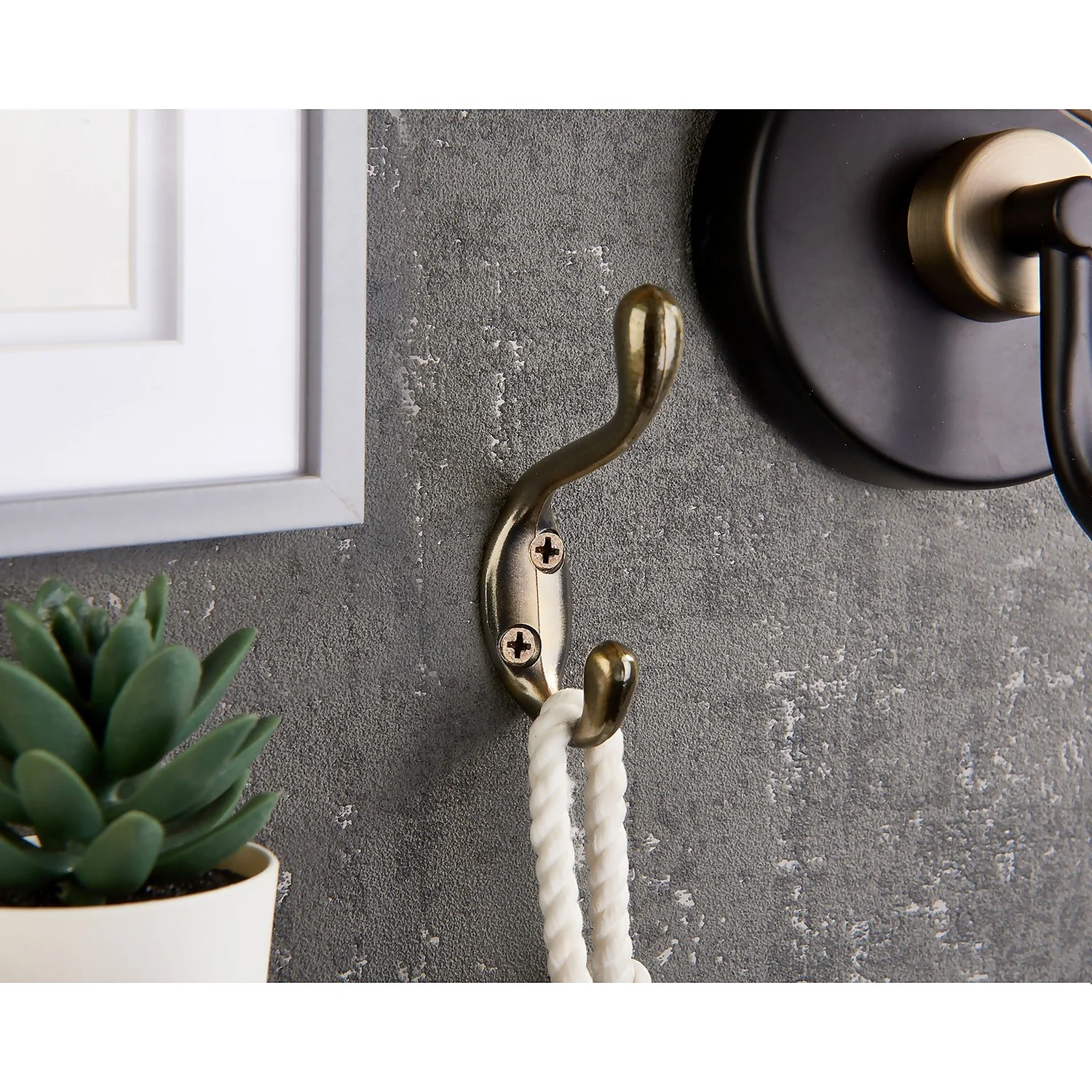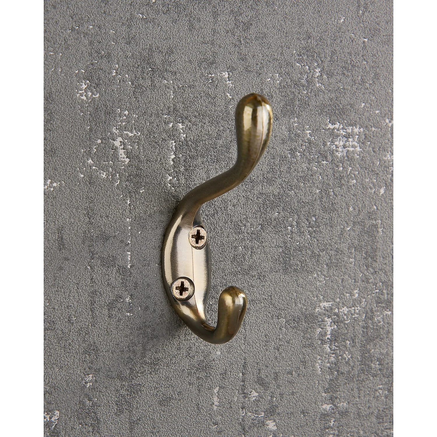Classic design double coat hook with a durable antique brass finish.