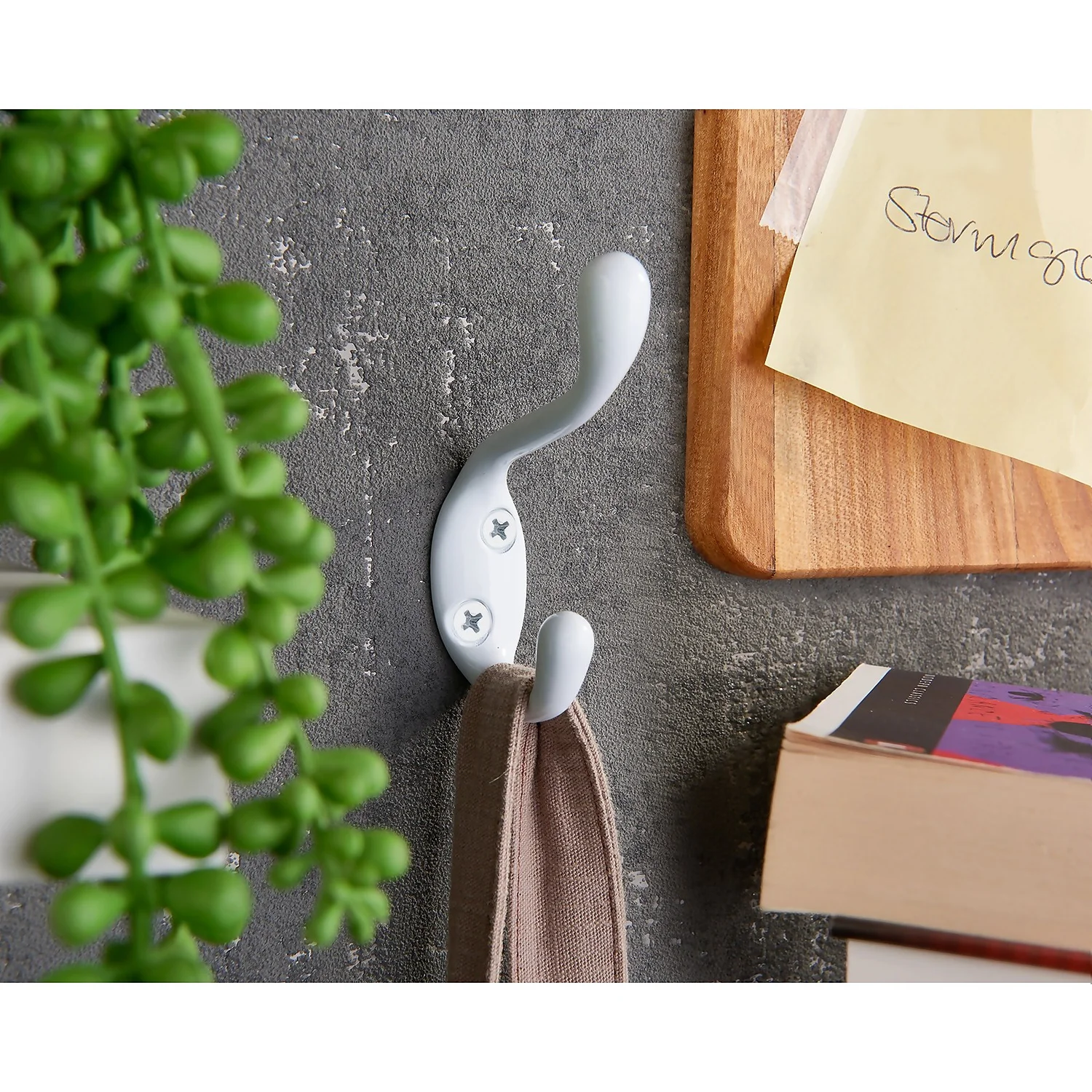 Classic design double coat hook with a durable white finish.