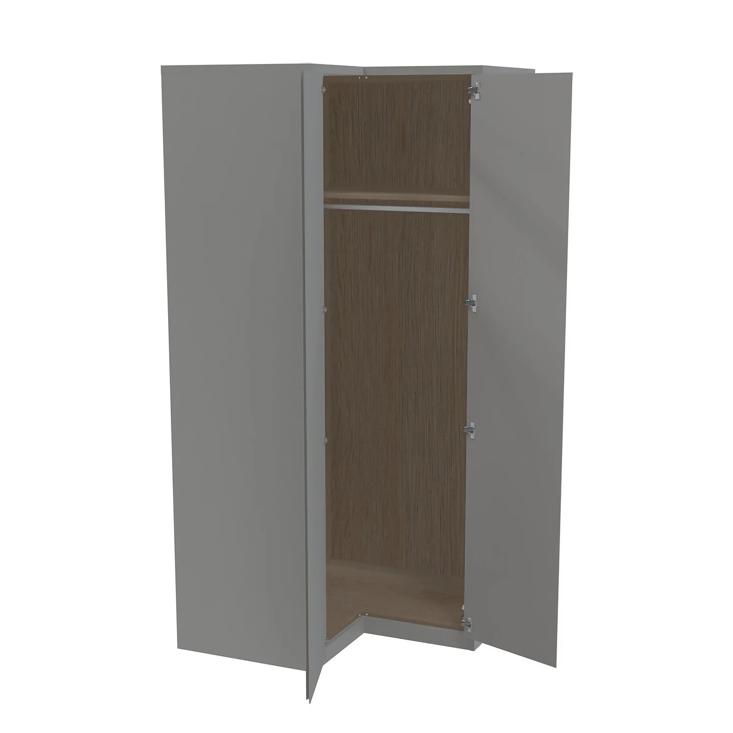 - The carcass features adjustable feet for levelling on uneven floors and is supplied with the instructions and components to secure to the wall (wall plugs not supplied). The corner wardrobe is a storage must have, it features five internal shelves and ample hanging space. A real solution for difficult bedroom spaces