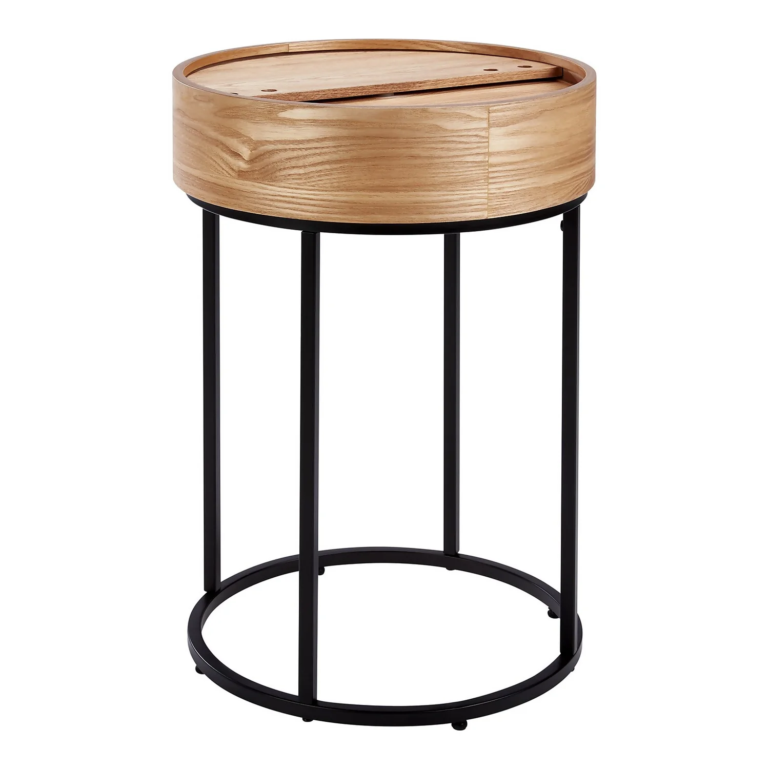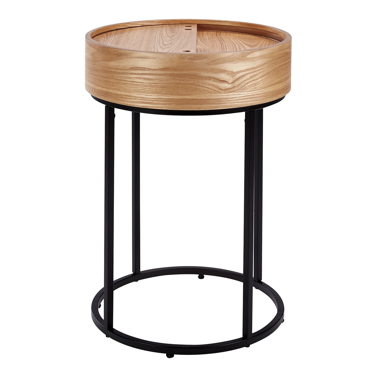 The Halo natural ash side table has a hidden storage space in the table top and an elegant black metal base.