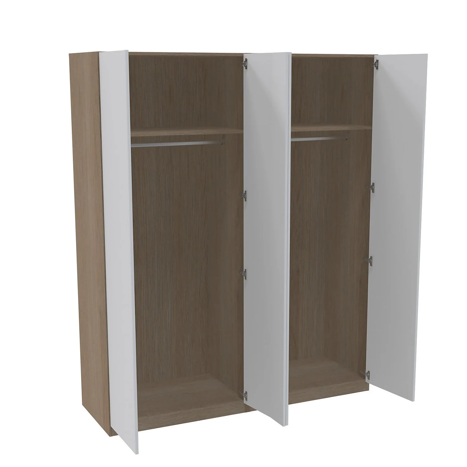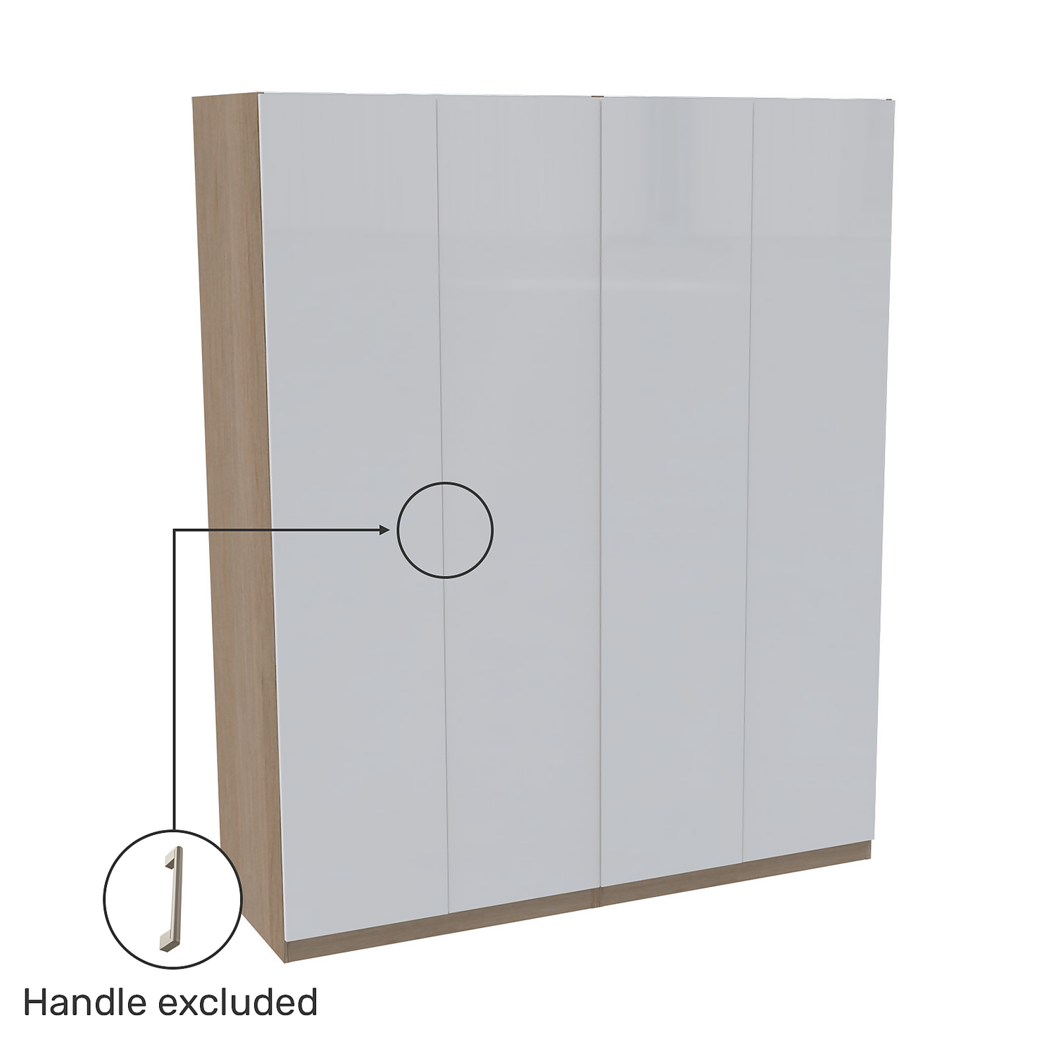 The House Beautiful range is exclusive to Homebase and offers a selection of different finishes and storage configurations to suit your needs. With a range of carcass colours and contrasting door designs, you can select the look to fit your bedroom aesthetic. This four door wardrobe (2 x double units) features an oak effect carcass and beautiful gloss white slab doors for a modern sleek look. The wardrobe features premium soft close clip-on Blum hinges, two shelves and two hanging rails. You can customise your wardrobe with our additional internal storage options (available separately) including internal drawers, shelves, dividing shelves and extra hanging rails. Choose your handles from our range of both traditional and modern to suit your desired look.