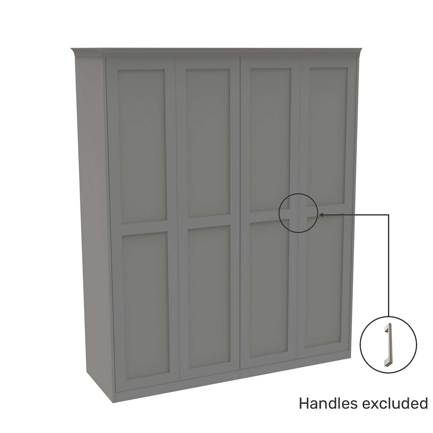 This four door wardrobe (2 x double units) features a grey internal carcass and includes end panels, plinth and matching cornice all in a finish to match the beautiful luxe matt grey shaker doors. The wardrobe features premium soft close clip-on Blum hinges, two shelves and two hanging rails. You can customise your wardrobe with our additional internal storage options (available separately) including internal drawers, shelves, dividing shelves and extra hanging rails. Choose your handles from our range of both traditional and modern to suit your desired look.