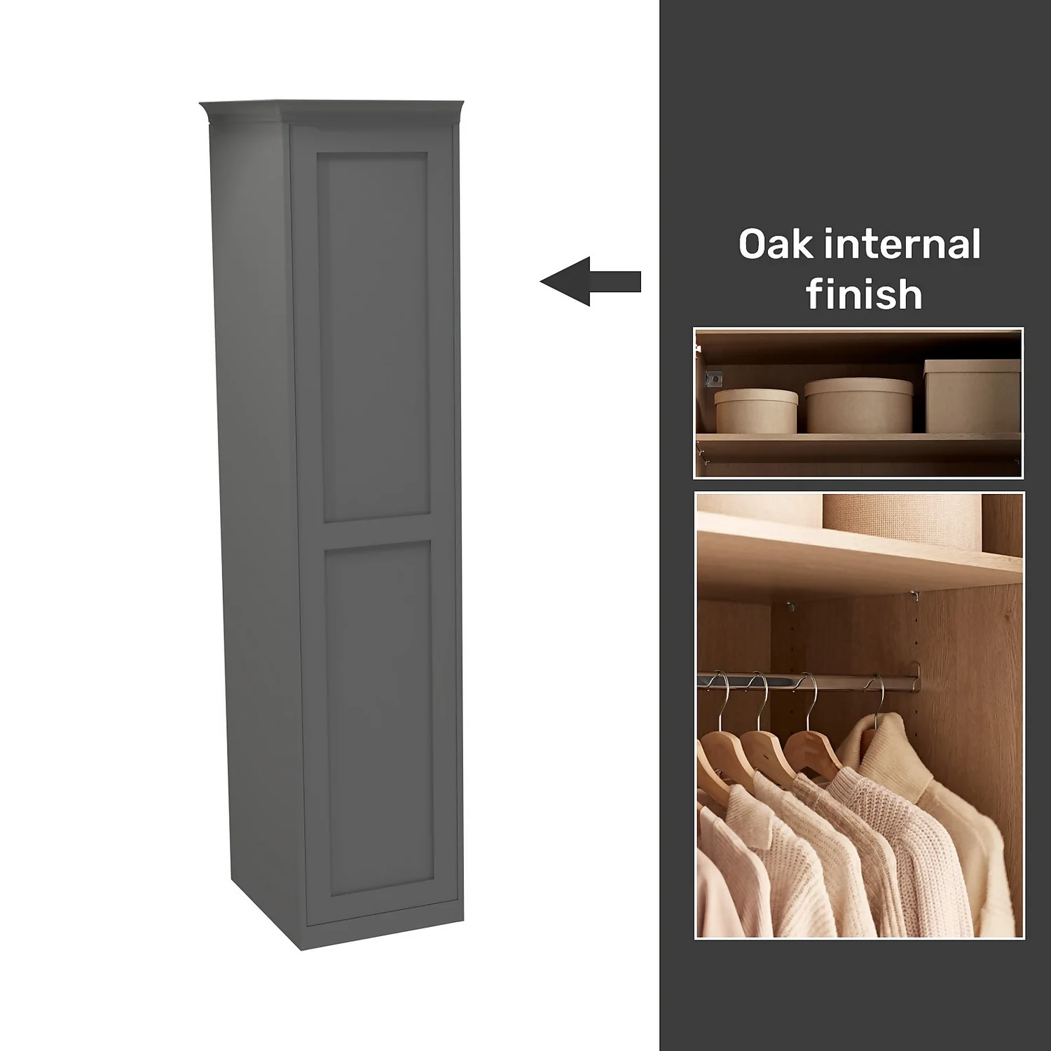 This single wardrobe features an oak effect internal carcass which includes end panels, plinth and matching cornice all in a finish to match the beautiful luxe matt carbon shaker door. The wardrobe features premium soft close Blum hinges, a shelf and a hanging rail. You can customise your wardrobe with our additional internal storage options (available separately) including internal drawers, shelves, dividing shelves and extra hanging rails. Choose your handles from our range of both traditional and modern to suit your desired look.