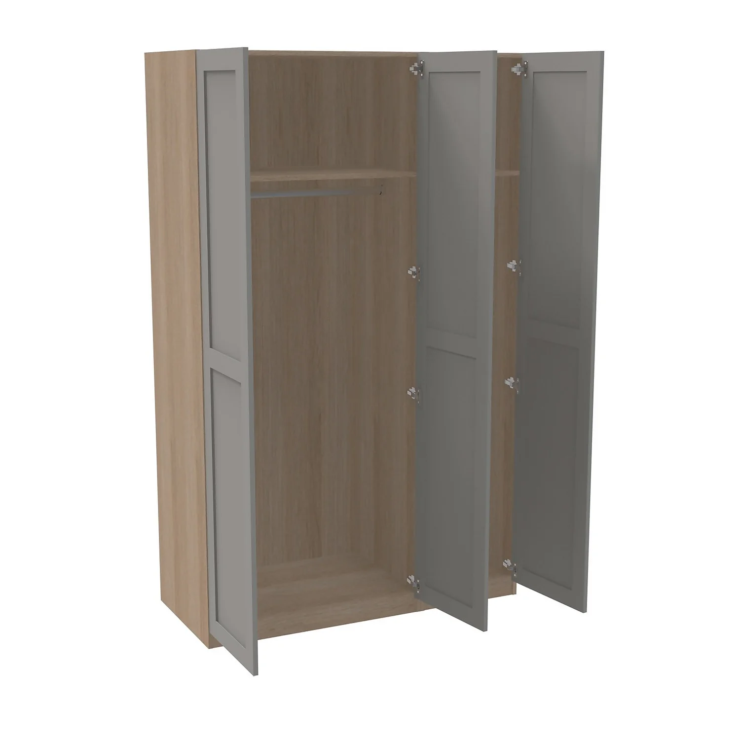 The House Beautiful range is exclusive to Homebase and offers a selection of different finishes and storage configurations to suit your needs. With a range of carcass colours and contrasting door designs, you can select the look to fit your bedroom aesthetic. This triple wardrobe (one double and one single) features an oak effect carcass and beautiful shaker doors finished in a luxurious matt grey. The wardrobe features premium soft close clip-on Blum hinges, two shelves and two hanging rails. You can customise your wardrobe with our additional internal storage options (available separately) including internal drawers, shelves, dividing shelves and extra hanging rails. Choose your handles from our range of both traditional and modern to suit your desired look.