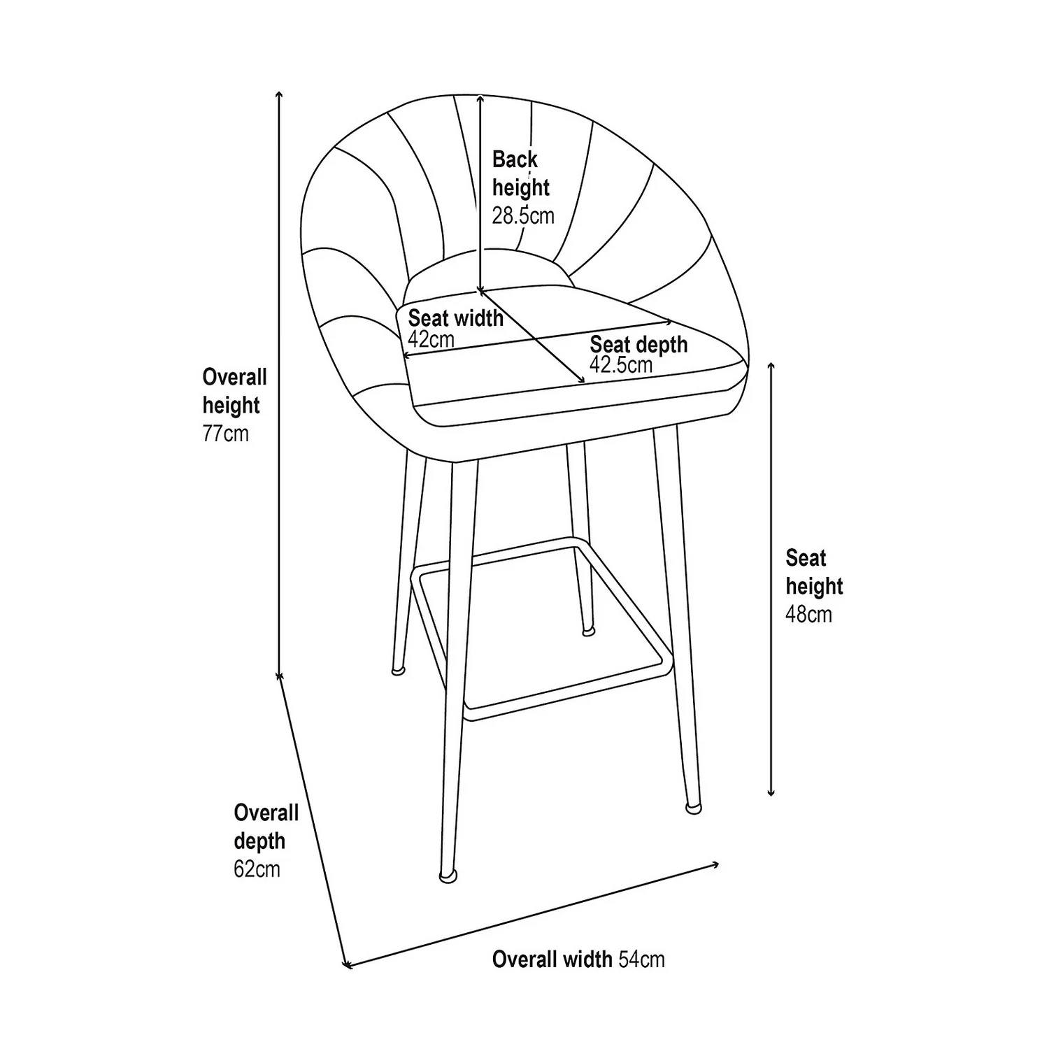 Add an elegant and sophisticated look to your breakfast bar with the Margot bar stool. The gently curved shape and cut-out back evoke a retro style while the soft, velvet upholstery and metal legs and crossbar bring a modern twist.